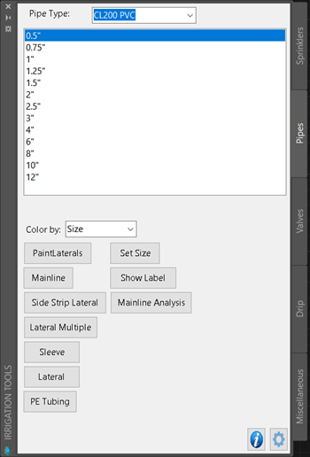 Pipes are represented with polylines. Each polyline can have only one size of pipe. Mainline pipes are constantly under pressure. Lateral pipes are only pressurized when the remote control valve controlling them are open. There are different types of lateral pipes available for sprinklers, PE Drip, Tree Drip, and Shrub Drip. PE Drip piping is represented the drawing with a curved spline. Users can specify the default (minimum) size and class of each type of lateral in the Pipes tab of the settings form.