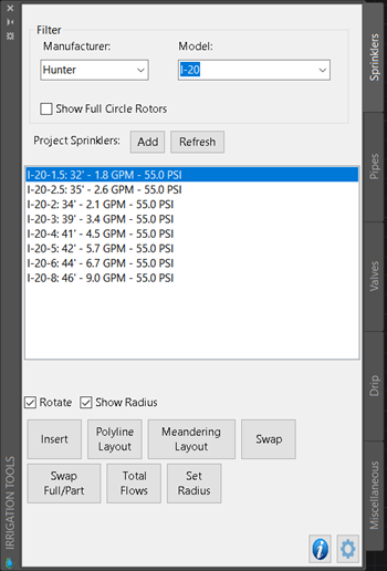 This command can be run by double clicking a sprinkler in the sprinkler tab, or using the Insert button. Moving the cursor into the drawing, a sprinkler is shown with the radius of the sprinkler as well as a 75% reduced radius for user reference. Clicking the cursor will insert the sprinkler at the chosen location. If the rotate box is checked, the user will be prompted to specify a rotation for the sprinkler block. Pressing the Q or A key while the command is active allows the user to change the nozzle's size or angle during the command. This command can also be run via the Insert button. Clicking near or on top of an exisiting sprinkler swaps the existing sprinkler for the new one, and attaches any pipe from the old sprinkler to the new one.